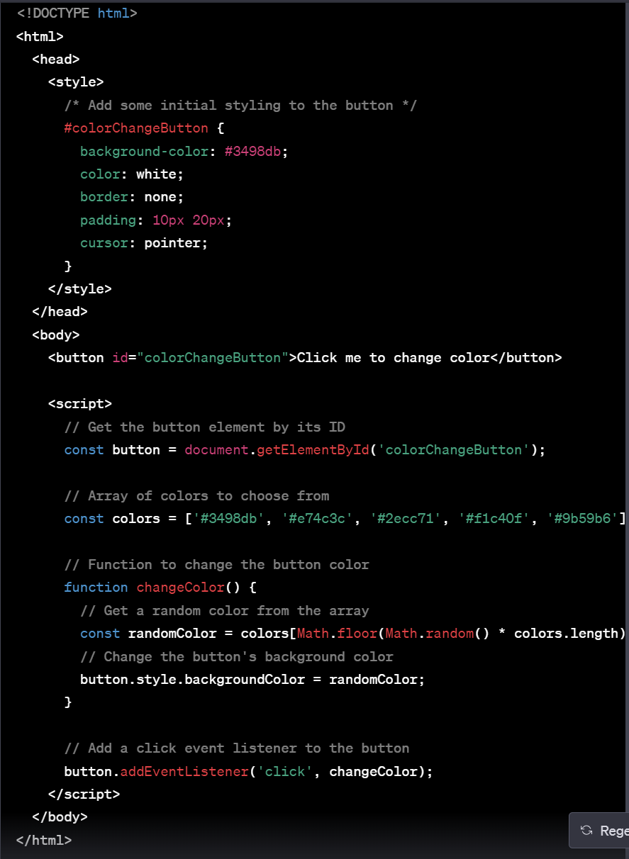 Out of the box the script works, changing the button color whenever clicked to one of an array of hex values.