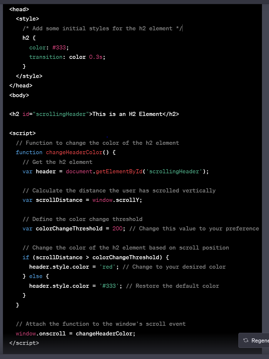 Straight out of the box the script works, but it's not exactly the kind of color transition I was imagining. I was not very specific, and chat GPT wrote one that returns to the default color after the scroll is complete.